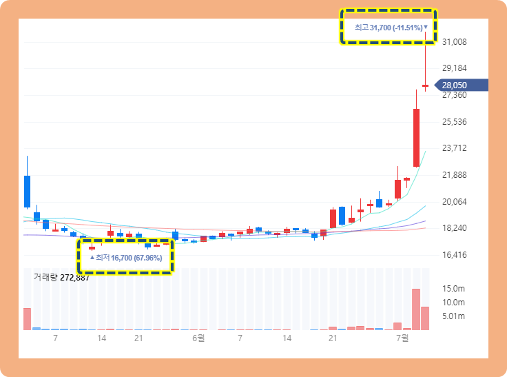 그리고 지난 6월 말경부터 주가가 갑자기 급등하기 시작하였고, 강세가 지속되면서 7월 5일에는 최고 31,700원까지 터치한 상황이네요.