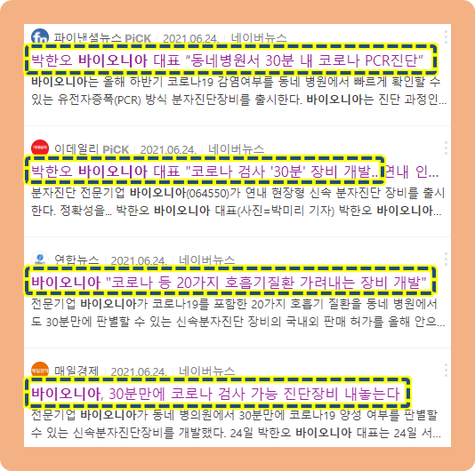 6월 24일, 바이오니아가 약30분 만에 코로나, 독감 등 바이러스 40종을 검사 가능한 유전자증폭 분자진단 장비를 2021년도 안에 출시할 계획이라고 발표했습니다.