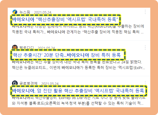 2021년 5월 24일, 바이오니아가 다양한 검체로부터 바이러스 등 핵산(DNA, RNA)을 추출할 수 있는 기술을 개발하여 특허 등록을 마쳤다고 합니다.