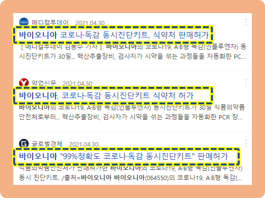 2021년 4월 30일 바이오니아가 코로나와 A형 및 B형 독감동시진단키트에 대해 식약처로부터 판매허가를 획득했습니다.