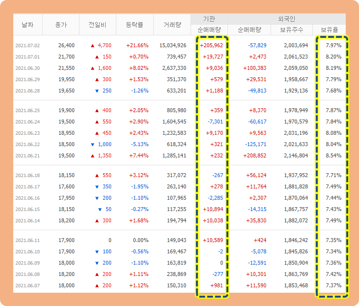 그리고 외국인 투자자의 지분율의 경우, 지난 한 달 동안 약 7~8%대를 유지하고 있는 모습이네요.