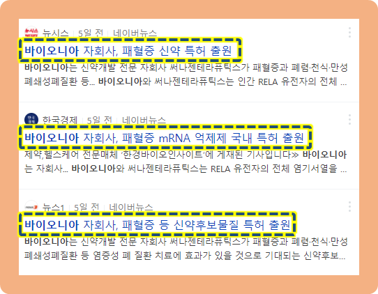 2021년 6월 30일, 바이오니아의 자회사인 써나젠테라퓨틱스가 염증성 폐질환 및 패혈증에 대한 치료제 역할을 하는 신약후보물질에 관한 특허를 출원했습니다.