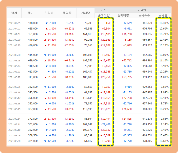 그리고 상승세가 이어지면서, 7월 1일에는 최고 473,000원까지 터치한 상황이네요.