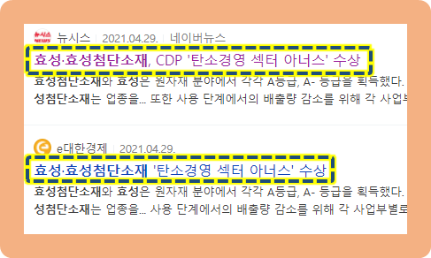 효성첨단소재와 효성은 원자재 분문에서 각 A등급과 A- 등급을 획득했는데, 특히 효성첨단소재는 업종 구분없이 고득점을 받은 기업들 중에서 3위로 선정되면서 최상위 5개 기업들에게 수여해주는 탄소경영 아너스 클럽에도 선정된 것입니다.
