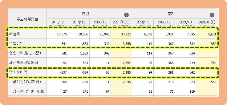 다행히 연간 당기순이익은 2020년도 기준으로 68억원 이익을 기록하면서, 전년도에 기록한 -529억원 대비 흑자 전환에 성공한 상황입니다.