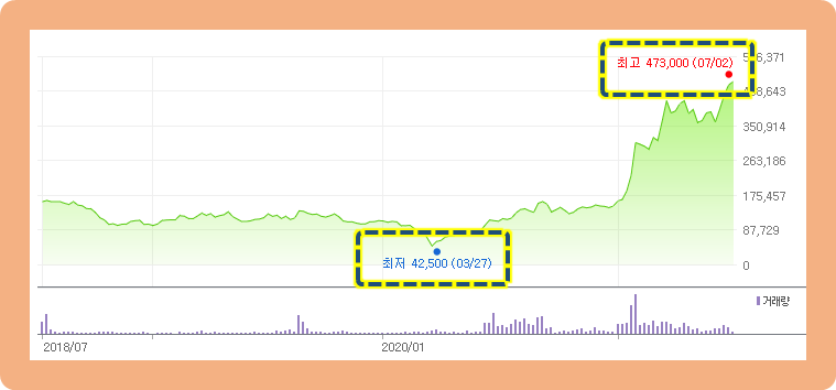 최저점은 2020년 3월에 기록한 42,500원이고, 최고점은 2021년 7월2일에 기록한 473,000원으로 약 1년 반만에 무려 10배 이상 증가한 종목입니다.