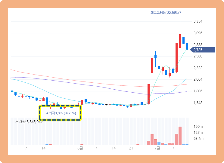 2021년 6월 28일부터 주가가 갑자기 급등하기 시작했고, 강세가 이어지면서 7월 9일에는 최고 3,510원까지 터치했었습니다.