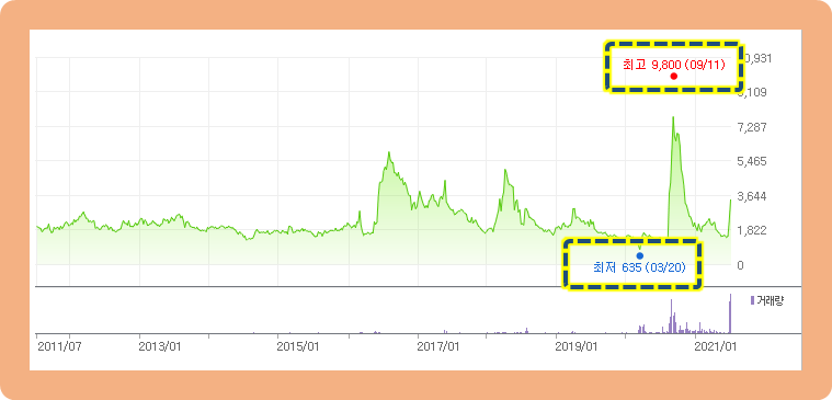 10년 동안 최저가는 2020년 3월에 기록한 635원이고, 최고가는 2020년 9월에 기록한 9,800원으로 약 6개월이라는 시간 동안 무려 15배 넘게 상승했었던 종목이네요.