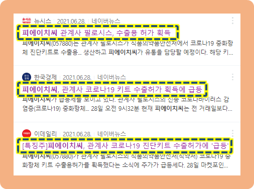 2021년 6월 28일, 피에이치씨의 관계사인 필로시스가 식약처로부터 코로나 중화항체 진단키트 수출 허가를 획득했다고 발표했습니다.