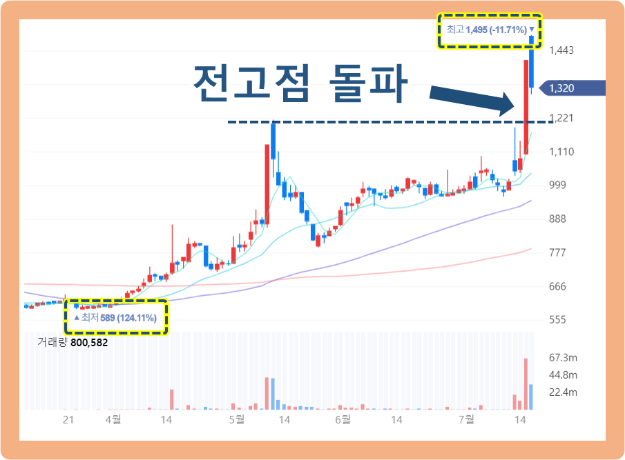 2021년 7월 14일부터 다시 한 번 주가가 급등하기 시작하더니, 최근에는 직전 전고점을 돌파하면서 7월 16일에 최고 1,495원까지 터치한 상황이네요.