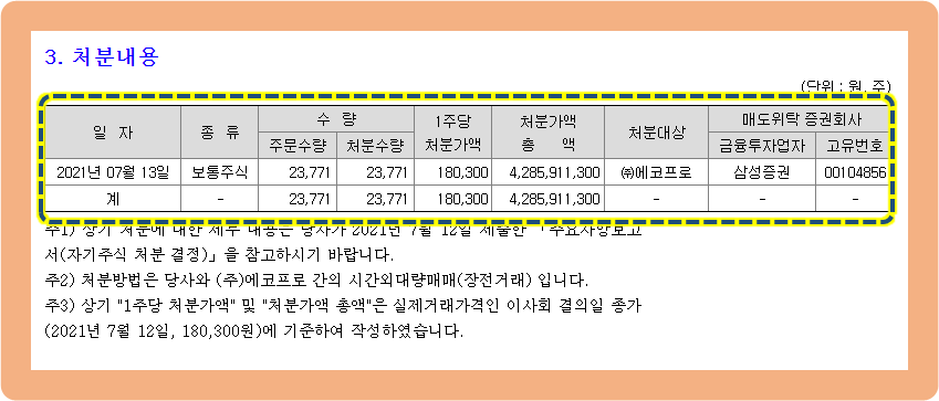 2021년 7월 14일 발표된 공시에 의하면, 에코프로에이치엔이 7월 13일에 자사주 2만3771주를 처분했다고 합니다.