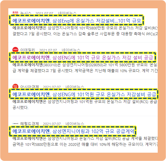 2021년 7월 7일, 에코프로에이치엔이 삼성엔지니어링과 약 102억원 규모의 온실가스 저감 설비 공급 계약을 체결했다는 공시가 발표되었습니다.