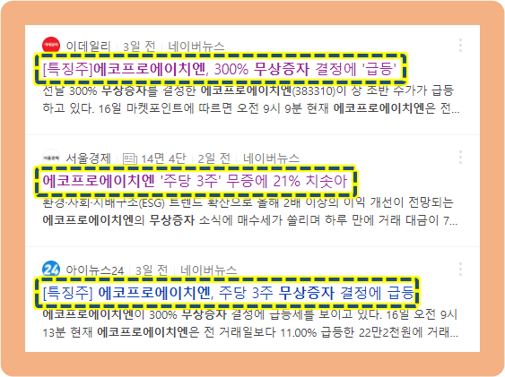 약 일주일 뒤인 2021년 7월 15일, 장 마감 후 공시를 통해 에코프로에이치엔이 보통주 1주당 신주 3주를 배정해주는 무상증자를 결정했다는 소식이 발표되었습니다.