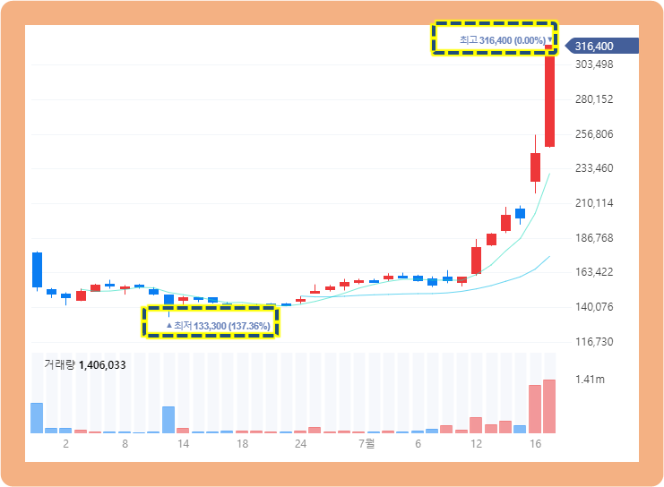 그리고 강세는 계속 이어졌으며, 7월 19일에는 상한가를 기록하면서 316,400원까지 상승한 상황입니다.