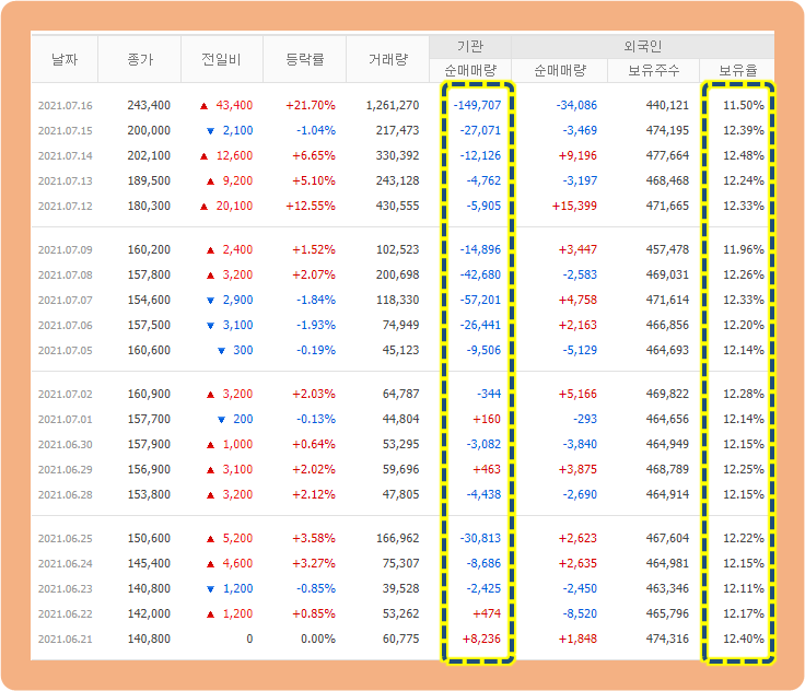 그리고 외국인 투자자의 지분율을 보시면, 한 달 전 12%대에서 최근 11%대로 내려왔네요.