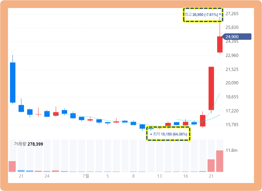 7월 20일부터 주가가 급등하기 시작하더니, 강세가 계속 이어지면서 7월 22일에는 상장 후 최고가격인 26,950원까지 터치한 상황입니다.