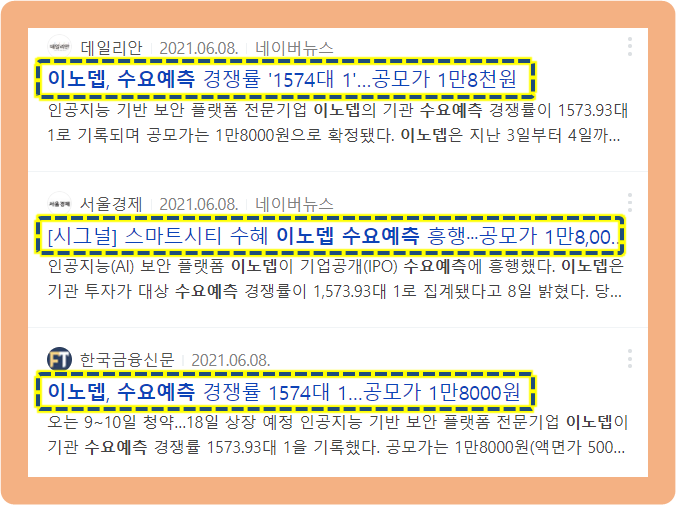 이노뎁이 상장하기 전인 2021년 6월 3일~4일 이틀 동안 진행 된 수요예측에서 약 1,574:1의 경쟁률을 기록했습니다.
