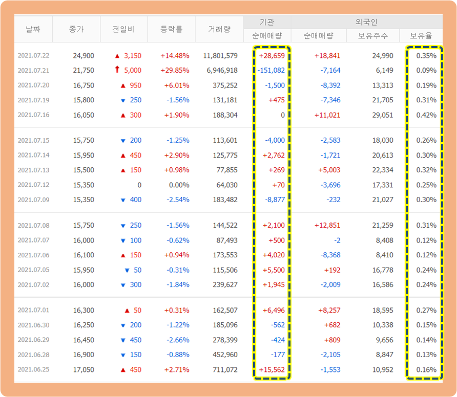 그리고 외국인 투자자의 경우에는 지난 한 달 동안 약 1% 미만대의 점유율을 유지하고 있는 모습이네요.