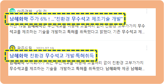 2021년 7월 19일 남해화학은 부산석고를 통해서 고열처리 없이 친환경 고부가가치 무수석고를 생산하는 기술에 관한 특허 취득 소식을 발표했습니다.