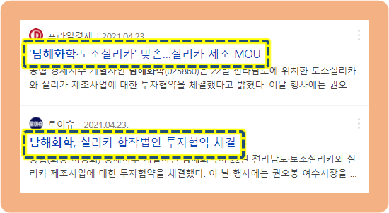지난 2021년 4월 22일, 남해화학이 토소실리카 및 전라남도와 실리카 제조사업에 관한 MOU를 체결했었습니다.