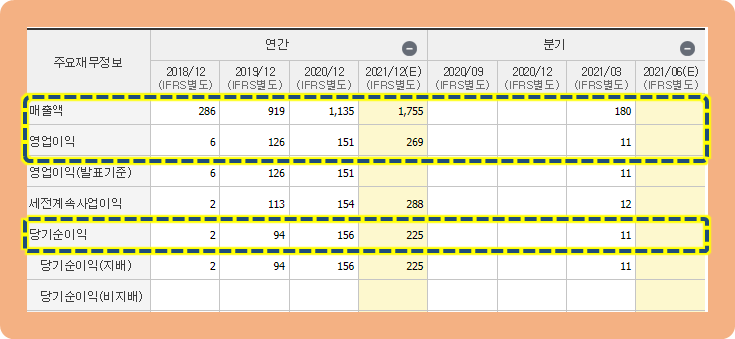 그리고 연간 영업이익도 2018년도에 6억원이였는데, 2020년도엔 151억원까지 증가했구요.