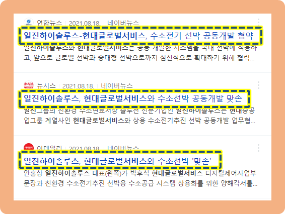 2021년 8월 18일, 일진하이솔루스가 현대글로벌서비스와 수소전기 선박을 공동으로 개발하는 협약을 체결했습니다.