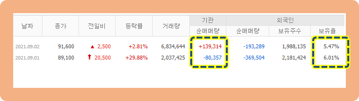 먼저 기관투자자의 경우를 보시면, 첫 날엔 매도세 위주였는데 둘째날엔 매수세가 급증한 모습을 보였습니다.