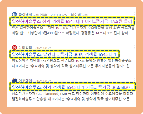 일진하이솔루스가 상장하기 전인 2021년 8월 19~20일, 기관 투자자를 대상으로 한 수요예측에서 기관 총 1611곳이 참여하며 1471:1의 경쟁률을 기록했다는 공시가 발표되었습니다.