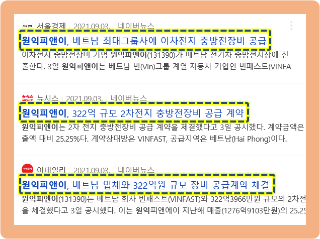 지난 2021년 9월 3일, 원익피앤이가 베트남에 위치한 빈 그룹 계열사 자동차 기업 빈패스트에 2차전지 충방전장비를 공급하는 계약을 맺었다는 소식이 발표되었습니다.