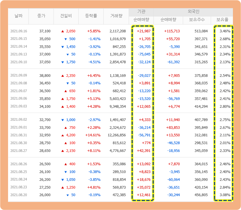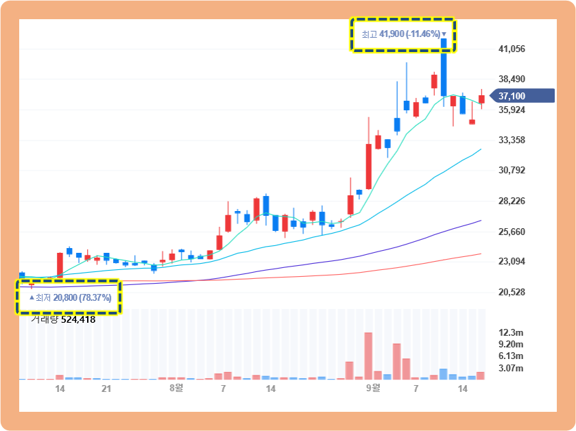 그리고 지난 2021년 9월 10일, 최고점 41,900원까지 터치하였구요.