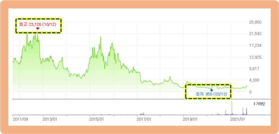 최고가는 2012년 10월에 기록한 23,126원이며, 최저가는 2020년 3월에 기록한 950원입니다.
