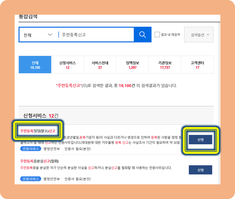여기에다가 세대주 변경을 위한 검색어 주민등록신고를 입력해줄거에요