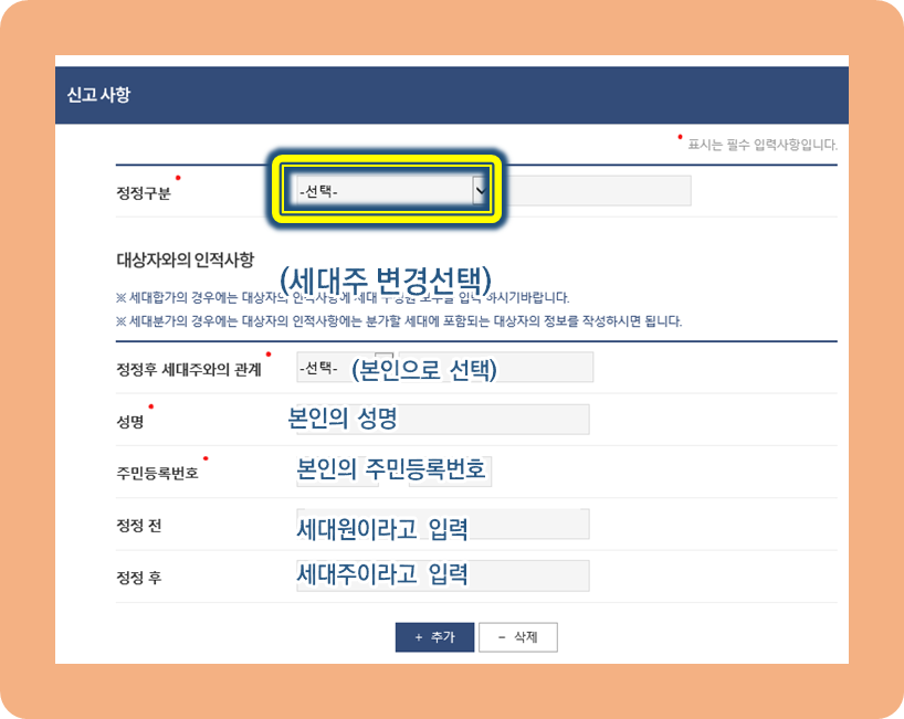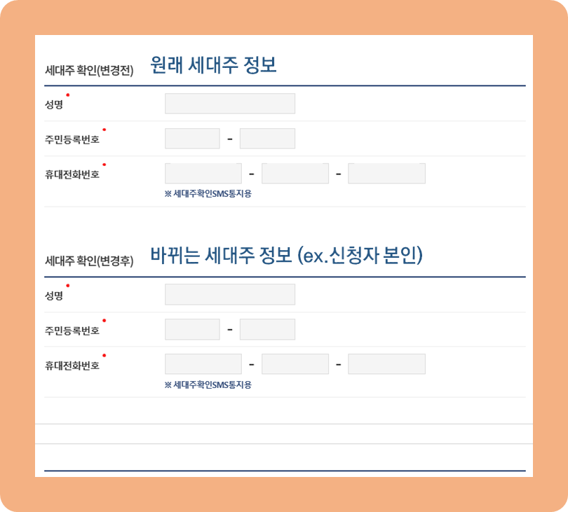 여기에 원래 세대주였던 분의 정보와, 그리고 이제 새롭게 세대주가 될 사람의 정보를 입력해주면 돼요~