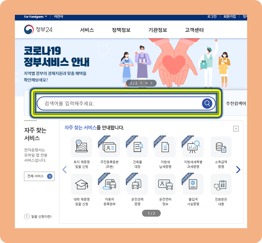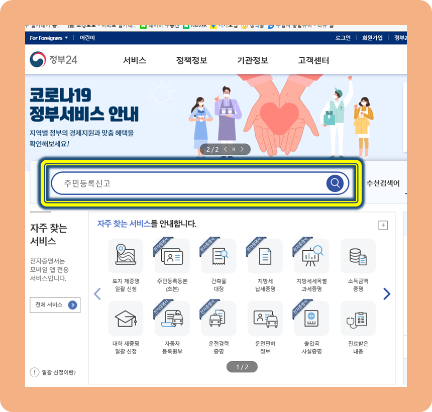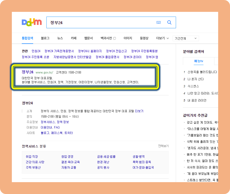 포털 검색창에 정부24를 입력하고 엔터를 누르시면 바로 보여요