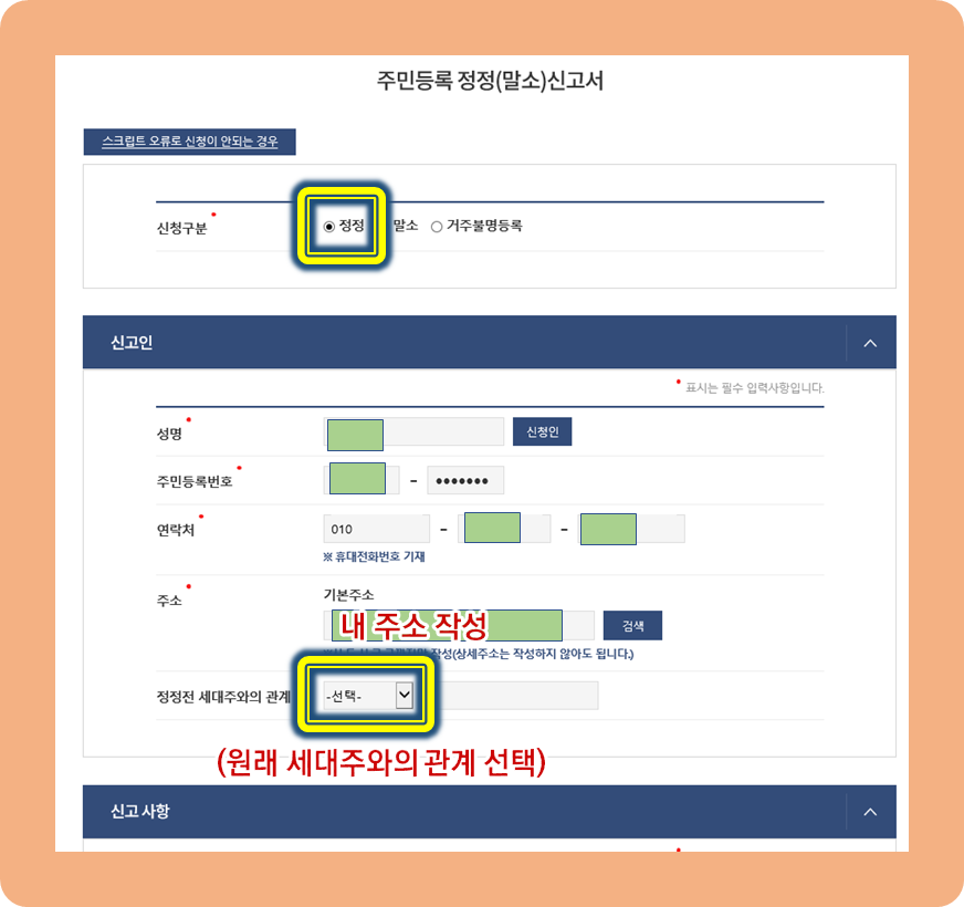 주민등록정정(말소)신고로 가주도록 할게요~ 신청 눌러볼게요~