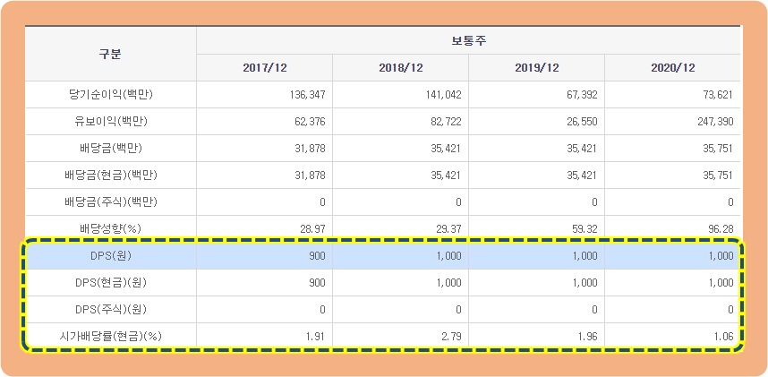 2017년도 배당금 : 900원 / 2018년, 2019년, 2020년 배당금 : 1,000원을 지급해주고 있습니다.