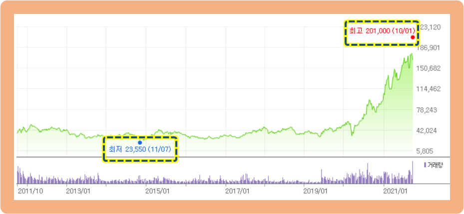 최저가는 2014년 11월에 기록한 23,550원이고, 최고가는 2021년 10월에 기록한 201,000원입니다.