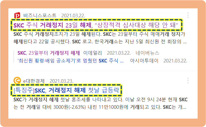 우선, 2021년 3월경에 있었던 SKC의 거래정지 관련 내용인데요.