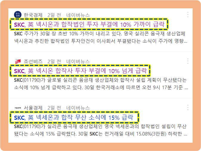 주가 하락 전 날 SKC는 이사회를 개최고 SKC과 넥시온의 합작법인 투자와 관련된 안건을 올렸지만 부결 처리된 것이죠.