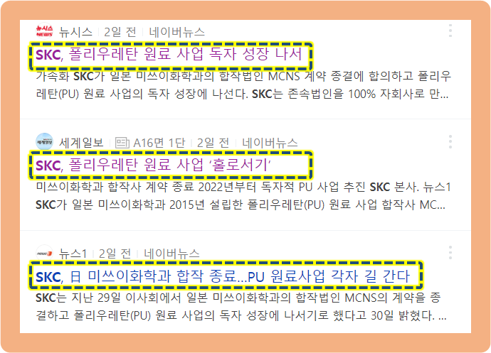 그리고 같은 날인 2021년 9월 30일, SKC는 일본 기업 미쓰이화학과 지난 2015년도에 설립한 폴리우레탄 원료 사업 합작기업 MCNS 계약을 끝내고 독자 사업에 나설 것이라고 발표했습니다.