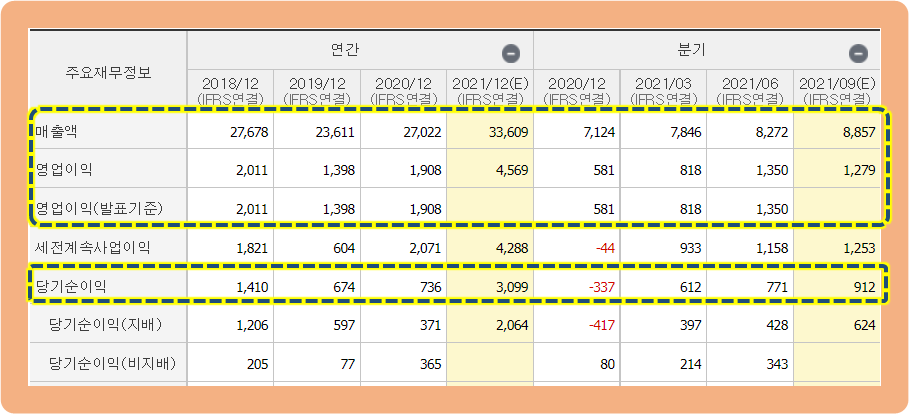 다행히 2021년도의 잠정 당기순이익이 약 3,099억원으로 전망되면서, 다시 약 4배 이상 증가할 것으로 보이네요.