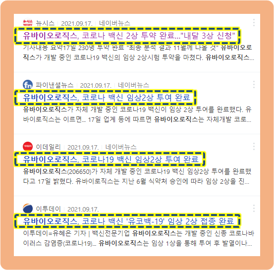 2021년 9월 17일, 유바이오로직스가 자체 개발하고 있는 코로나 백신에 대한 임상 2상 투여가 완료되었습니다.