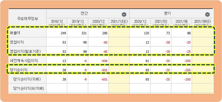 그리고 연간 당기순이익도 2020년도에 -601억원 손실을 기록하면서, 전년도 대비 손실 폭이 더욱 확대되며 2년 연속 적자를 이어나가고 있는 모습이네요.