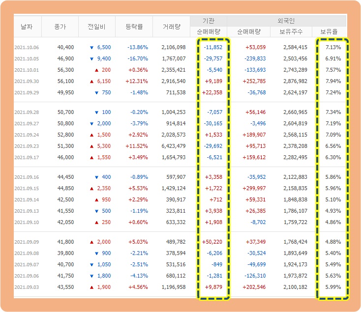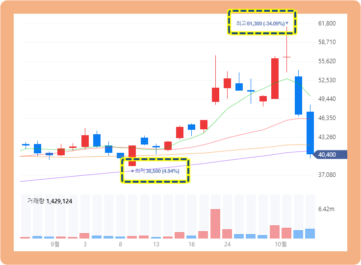 최고점 터치 후 바로 이틀 연속 장대 음봉이 나타나면서, 10월 6일에는 40,400원까지 하락하며 장을 마감한 상황이네요.