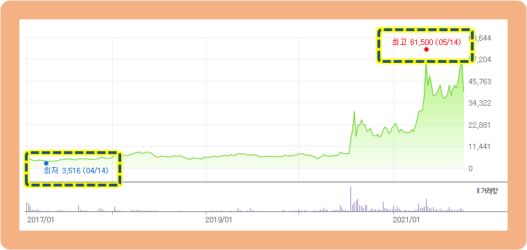 최저가는 2017년 4월에 기록한 3,516원이고, 최고가는 2021년 5월에 기록한 61,500원입니다.