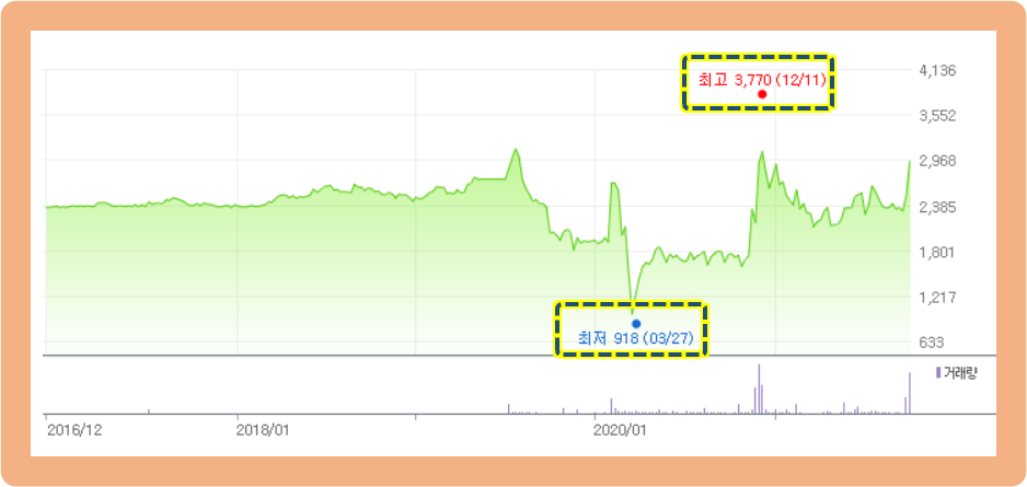 최저가는 2020년 3월에 기록한 918원이고, 최고가는 2020년 12월에 기록한 3,770원인데요.