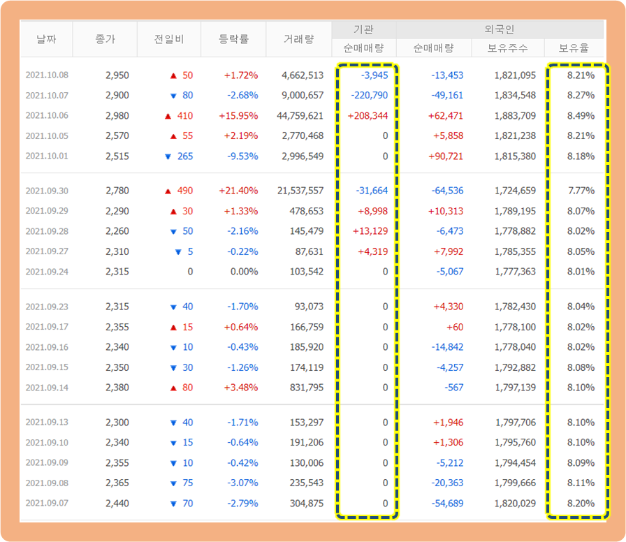 장대 양봉 이후 상승세가 이어지면서 2021년 10월 6일에는 최고 3,340원까지 터치했었는데, 지금은 다소 조정을 받으며 다시 2,950원까지 내려온 상황이네요.