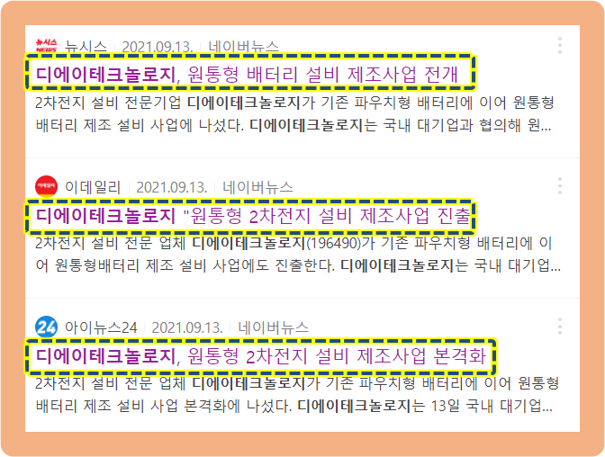 2021년 9월 13일, 디에이테크놀로지가 우리나라 대기업과 협력하여 원통형 2차전지 설비를 제조 중이며 영역 확대를 위한 역량을 강화 중이라는 소식을 발표했습니다.
