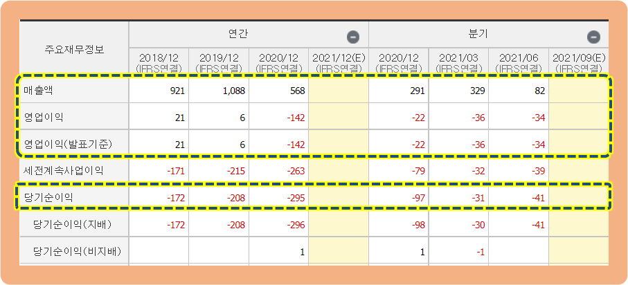 연간 당기순이익을 보시면, 최근 3년간 계속해서 적자를 기록하고 있는 모습이네요.