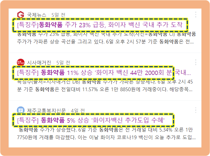 이날 화이자 코로나 백신이 추가로 도입되었다는 소식으로 인해, 화이나 관련주로 분류되어 있는 동화약품이 수혜를 받아 강세를 보인 바 있습니다.